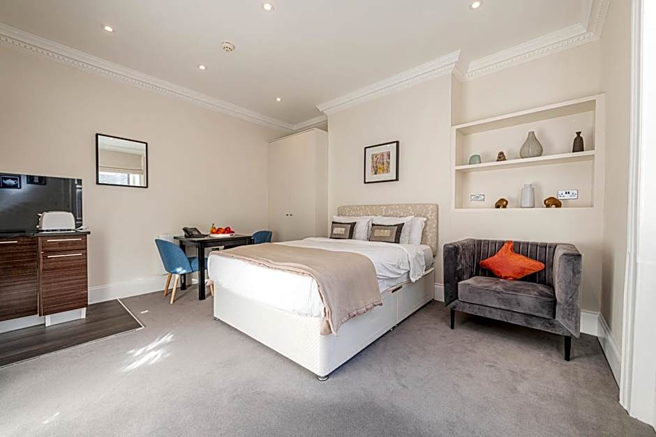 This studio apartments feature a spacious living area with a King-sized bed, kitchenette and bathroom with shower. Also has contemporary décor finished in gray tones. There is a TV, WIFI, and an iPod docking station, as well as a kitchen with kettle, microwave, hob and a fridge. Kindly note extra beds cannot be accommodated in the Studio.